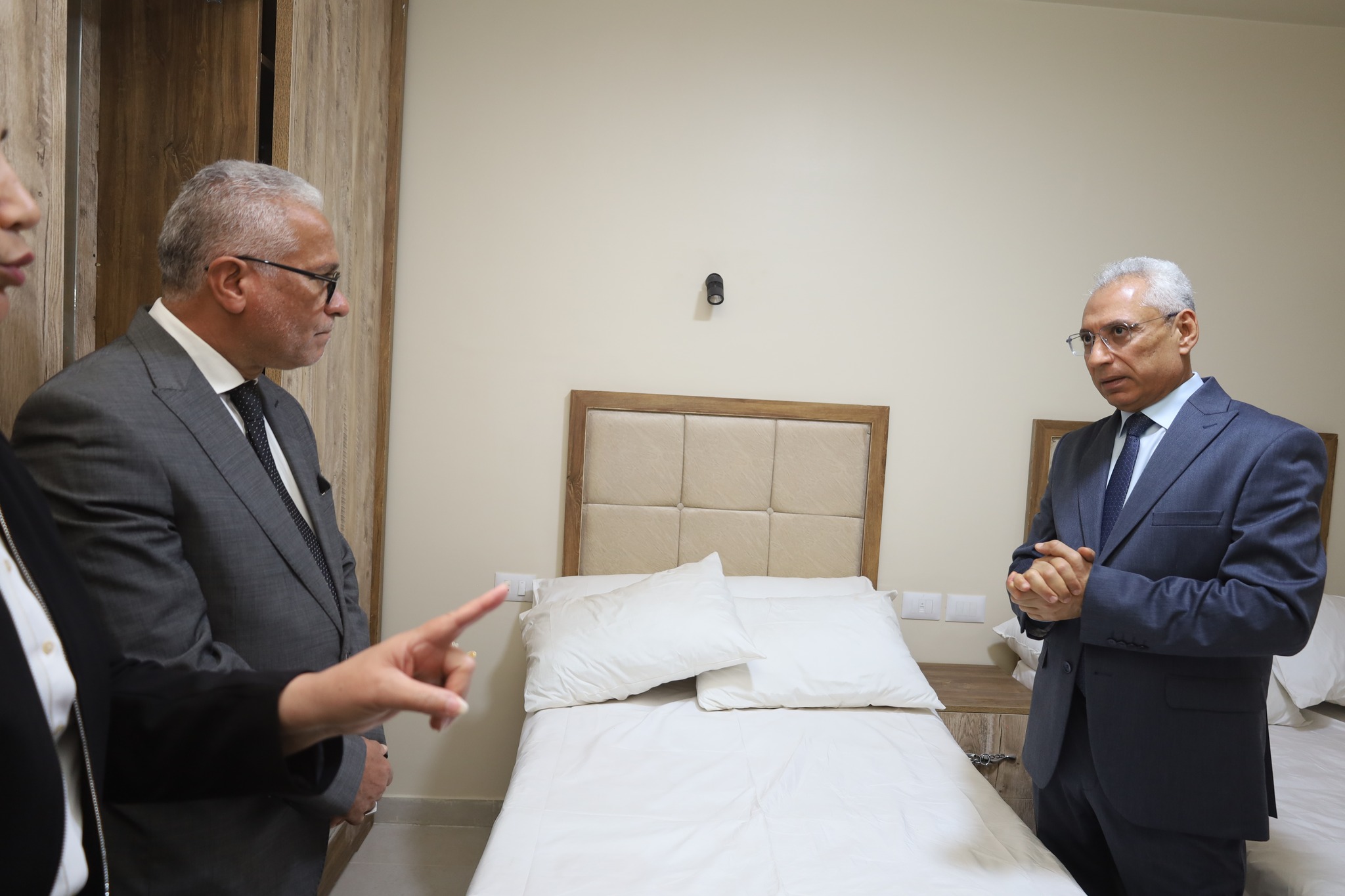 وقد اطمأن رئيس الجامعة على أن الأعمال تُنفذ وفقًا لمعايير فندقية تضاهي مستوى الـ 3 نجوم، حيث تم تجهيز كل غرفة بحمام خاص، وسريرين منفصلين، وشاشة عرض، ومكتبين، وثلاجة صغيرة، ودولاب، إلى جانب جناح خدمات بكل طابق، بما يضمن بيئة متميزة ورعاية متكاملة للطلاب.