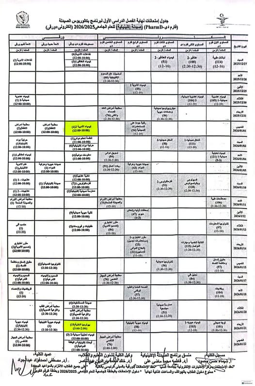 The Faculty of Pharmacy announced exam schedules for PharmD (Clinical Pharmacy) program for the first semester of the academic year 2025/2026.